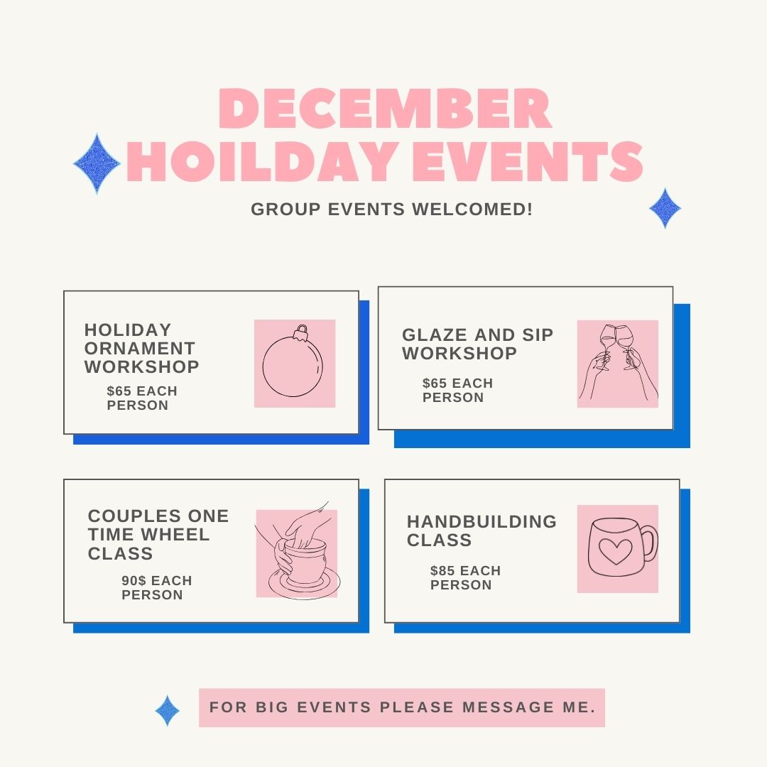 For the holiday season I have a variety of fun group activities that you can plan with your friends and family. To book any of these events please message me on instagram @potterydiariess or email me at shop.potterydiaires@gmail.com.